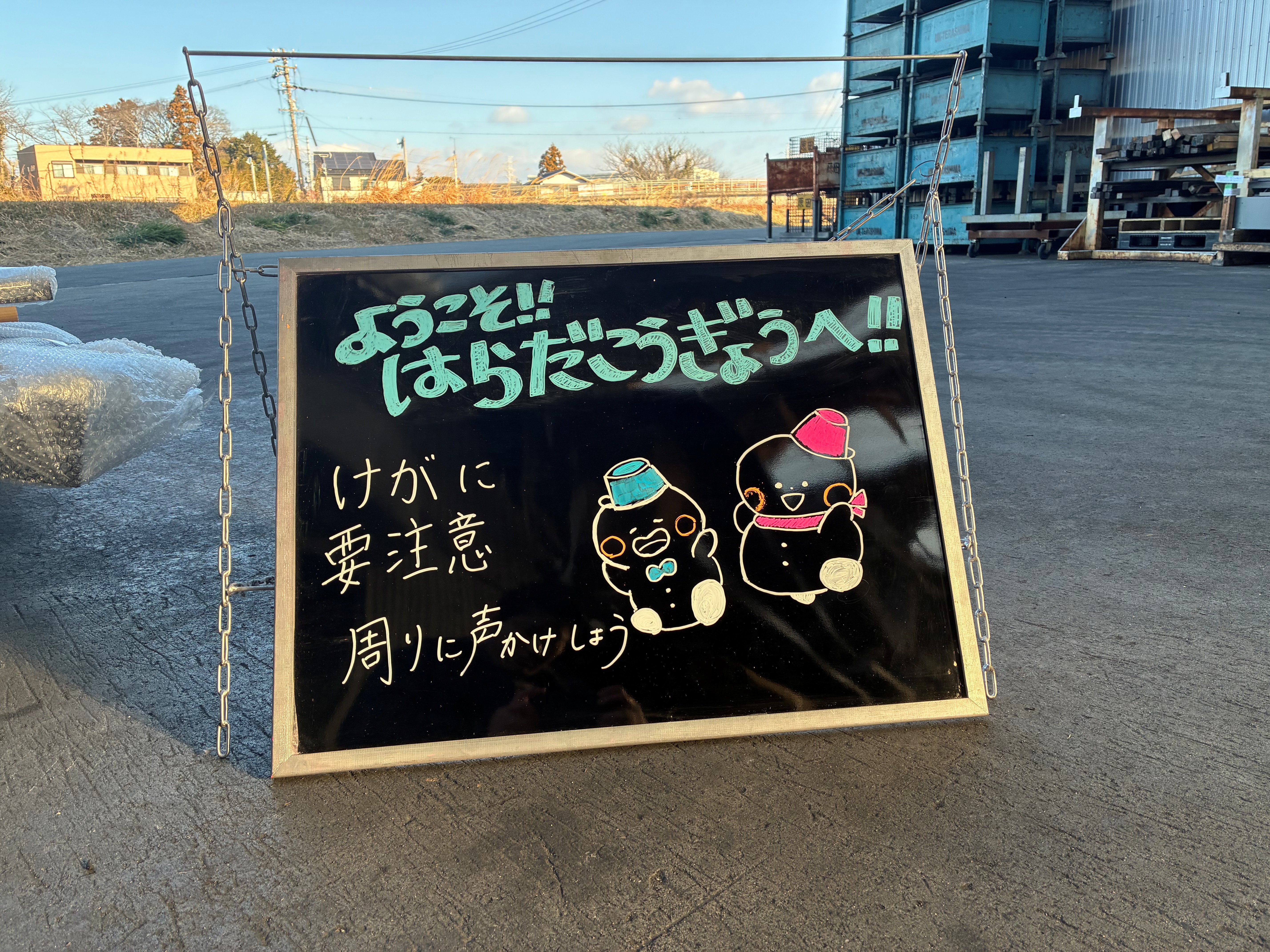 原田工業所では事務所玄関前にブラックボードに手書きのメッセージが書いてあります。
